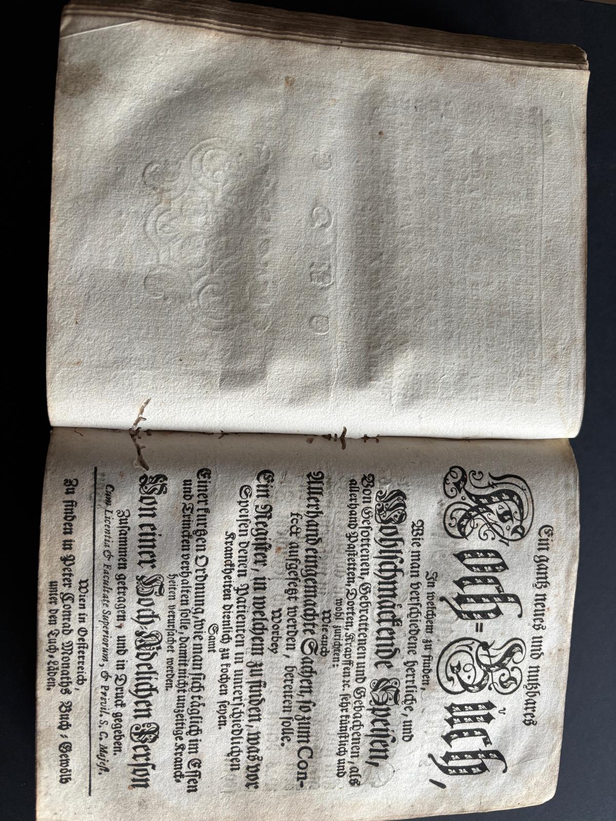 Freywillig aufgesprungener Granat - Apffel des christlichen Samariters. Oder: Aus christlicher Liebe des Nächsten eröffnete Geheimnisse vieler vortrefflicher Artzneyen, aus berühmter Leib - Aertzten, oder Medicin - Doctorn, lang gepflogener Erfahrnheit von der Durchlauchtigsten Herzogin, Fürstin und Frauen Frauen Eleonora Maria Rosalia, Herzogin zu Troppau und Jägerndorff, gebohrner Fürstin zu Lichtenstein etc. zusammengetragen. Samt einer Diaet, wie sich bey jeder Kranckheit in Essen und Trincken zu verhalten; wie auch einem neuen Koch - Buch, in welchem allerhand rare und denen Patienten zu verschiedenen Kranckheiten ersprießliche Speisen vorgeschrieben werden.